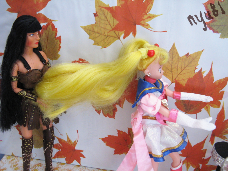 Xena: Non tollero chi si fa beffe di me! Non osare mai più rivolgermi la parola! Sailor Moon: Ahi! Ahi! Ahi! Lasciami andare, prometto che non ti darò più fastidio! |